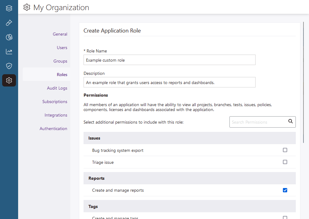 Note: Only organization administrators can create and manage custom roles. The default application-level roles (Administrator, Contributor, Member, and Observer) cannot be modified.