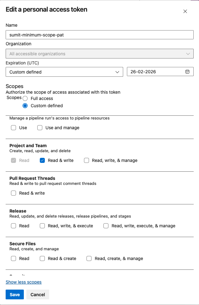 Important: Token must be created by an Azure DevOps Organization Owner or users with the "Manage organization webhooks" permission, who are authorized to manage organization webhooks. Although other Azure users may be able to select the scope requirements when creating a token, the token will not work due to permission requirements in Azure to manage organization webhooks.