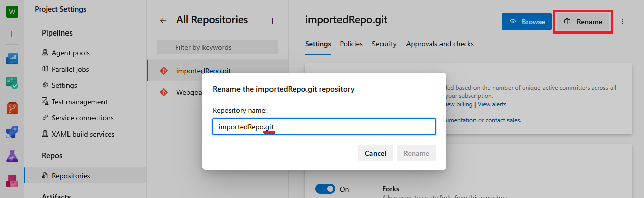 Important: When you import a Git repository from a third-party SCM provider into your Azure DevOps project, Azure DevOps may append ".git" to the end of the repository's name. When this occurs, Polaris will not accept the repository's URL.